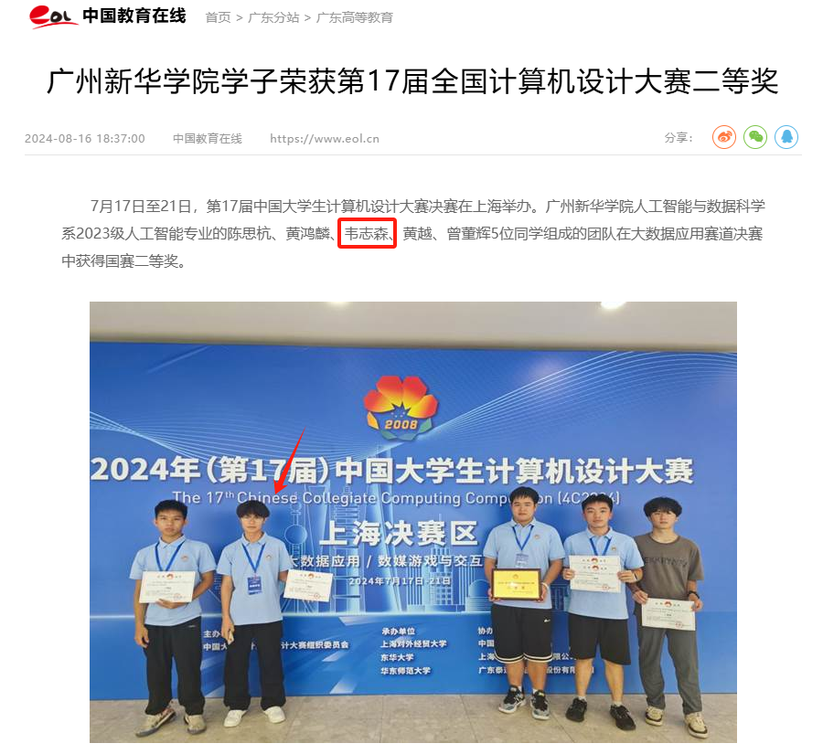 图 韦志森(左二)竞赛获奖被报道