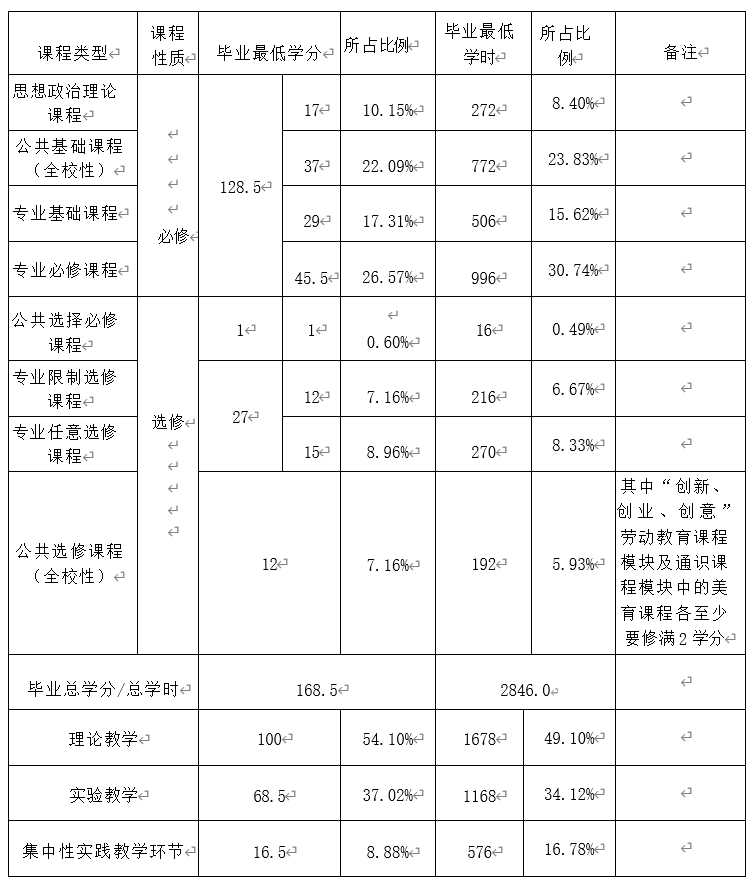 毕业总学分 168.5 学分,其中理论教学 100 学分,实验教学 68.5 学分,集中性实践教学环节 16.5 学分。太阳集团教学占总学分 45.94%。