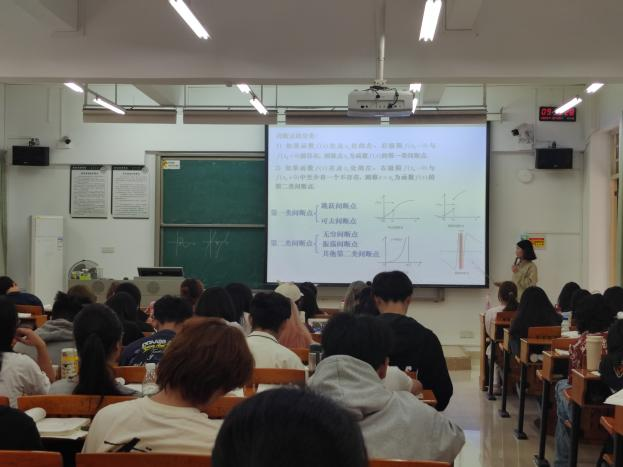 •第8周周三,王世云老师讲解《函数的连续性》时,创新采用“图形分析+ 理论解读”模式,将函数连续的条件转化为直观的图像语言,让抽象知识更易理解;邓丽朝老师围绕《函数的间断点》展开教学,通过分类梳理间断点类型、归纳判断方法,帮助学生搭建完整的间断点知识体系,提升知识迁移与应用能力。