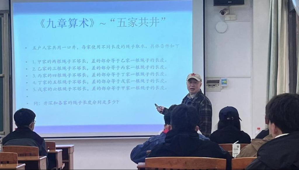课堂伊始,熊主任别出心裁地以中国古代数学经典《九章算术》中的“五家共井”问题引入,将同学们的思绪带入神秘而精妙的数学世界,顺势引出线性方程组的数学原理。这一独具匠心的导入设计,宛如一颗石子投入平静湖面,不仅激起了同学们浓厚的学习兴趣,更引发了大家对古代数学智慧的深深思索。熊主任并未止步于数学知识的传授,而是深入挖掘该问题背后的思政富矿,着重强调中国古代数学在人类文明史上熠熠生辉的卓越成就,让同学们在领略数学魅力的同时,民族自豪感油然而生,文化自信深深扎根心底。他语重心长地指出:数学,从来都不只是科学的工具,更是文化传承的关键纽带,承载着古人的智慧与精神。这种将专业知识与思政教育交汇融通的创新教学模式,使同学们真切体会到数学的无穷魅力与深远价值,为新学期的课程学习注入了强大的精神动力。
