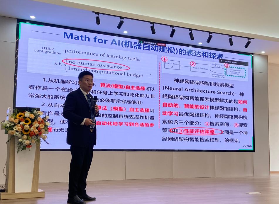 随后,郝教授进一步阐述了“Math for AI”的重要性。他指出,数学作为人工智能技术的基石,在模型自动评估和算法优化中发挥了不可替代的作用。他以多个实际案例为支撑,展示了自动数学建模技术如何助力人工智能算法设计与性能提升。郝教授特别强调,数学的逻辑性和严谨性为人工智能的发展提供了强有力的理论支撑,这一领域将成为未来研究的重点方向之一。
