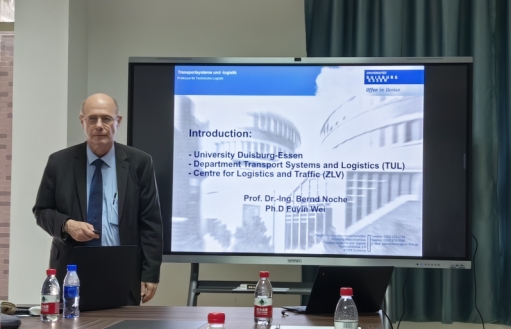 Bernd Noche教授介绍了德国杜伊斯堡艾森大学,校区位置在欧洲工业区—德国鲁尔区,距离柏林开车4小时,交通非常便捷。杜伊斯堡是渝新欧铁路的终点,欧洲物流的中心,也是一带一路国家科技合作项目的终点站。Bernd Noche教授从1987年开始孵化成立公司,主要做仿真模拟、软件方面。物流港是一个欧洲促进项目的重要例子,物流港发展了1、2、3期。AI人工智能应用于物流港调度、数据分析等方面。杜伊斯堡艾森大学是德语区最好的高校,最大的硕士点,目前有600-700名在读硕士。该校没有本科生,主要培养硕士生和博士生,拥有高水平的物流教学,招硕士生工程背景、IT背景、数据统计背景即可,培养交叉学科人才。硕士生毕业前景很好,就业机会多,例如科研,纳米科学、生物医药、城市系统等方向。Bernd Noche教授介绍了相关科研项目,例如数字化物流规划及仿真、工业及城市系统项目产品、物流仿真应用实例-交通路口仿真、一带一路国家科技合作项目、成立了浙江省重点企业研究院及海外技术研发中心和中国国际投资促进中心(德国)。在申请项目中,建议物流与数字技术结合,研究领域可以从食品行业、化工行业、农业、医疗方面进行。
