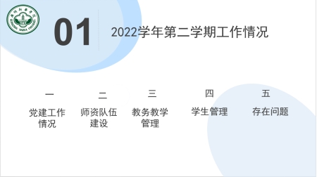 首先,关于2022学年第二学期工作情况,熊主任从党建工作、师资队伍建设教务教学管理学生管理及存在问题等五个方面详细进行了说明。