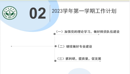 接下来是2023学年第一学期工作计划。加强党的理论学习,做好师资队伍建设;继续做好专业建设;抓科研,提质量,促发展。