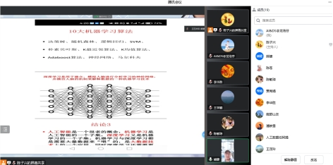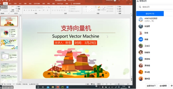 会上,陈苍老师通过五个方面详细介绍了《支持向量机》。她说道:“我们要通过平面的不同点,通过非线性变化,运用SVM分类器等方法找到最大的超平面,每个样本点都有标签。”紧接着继续介绍了支持向量、间隔、超平面。以使用二元分类问题为例,把问题讲的明白易晓。通过对超平面的描述、对偶问题的求解、非线性可分支持向量机原理、SVM的优缺点、软间隔方面进行讲解,由点到面,由浅入深,让听者们有所收获。