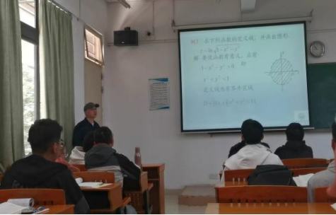 紧接着,展开了多元函数的极限和连续性这一章节的教学中,通过“截竿入城”等实例,引导学生们需要学会思考,比如不要把三维欧式变换限制在二维,有时不会变通就不能得到解决问题的最佳方案,还有在许多问题的实际问题中,由于一个结果的出现往往是由多个因素共同作用的结果,即一个结果涉及到多方面的原因,以及研究一个变量和多个其它变量之间的关系,并由此引入多元函数以及多元函数的微分和积分问题。随后,熊主任先介绍了多元函数的概念中二元函数的定义,并类推三元函数及其他多元函数。最后,讲解了二元函数的定义域,并在实例练习过程中让同学们掌握了二元函数的相关知识,如定义域,定义域的分类等。