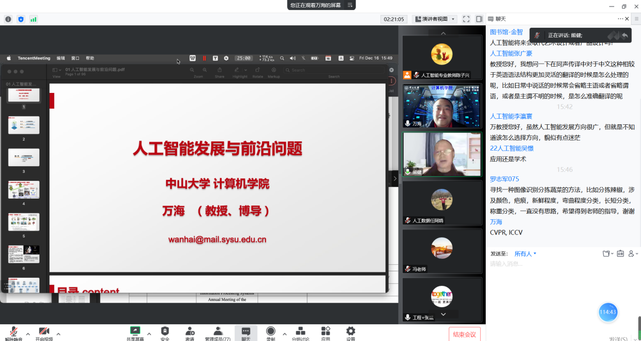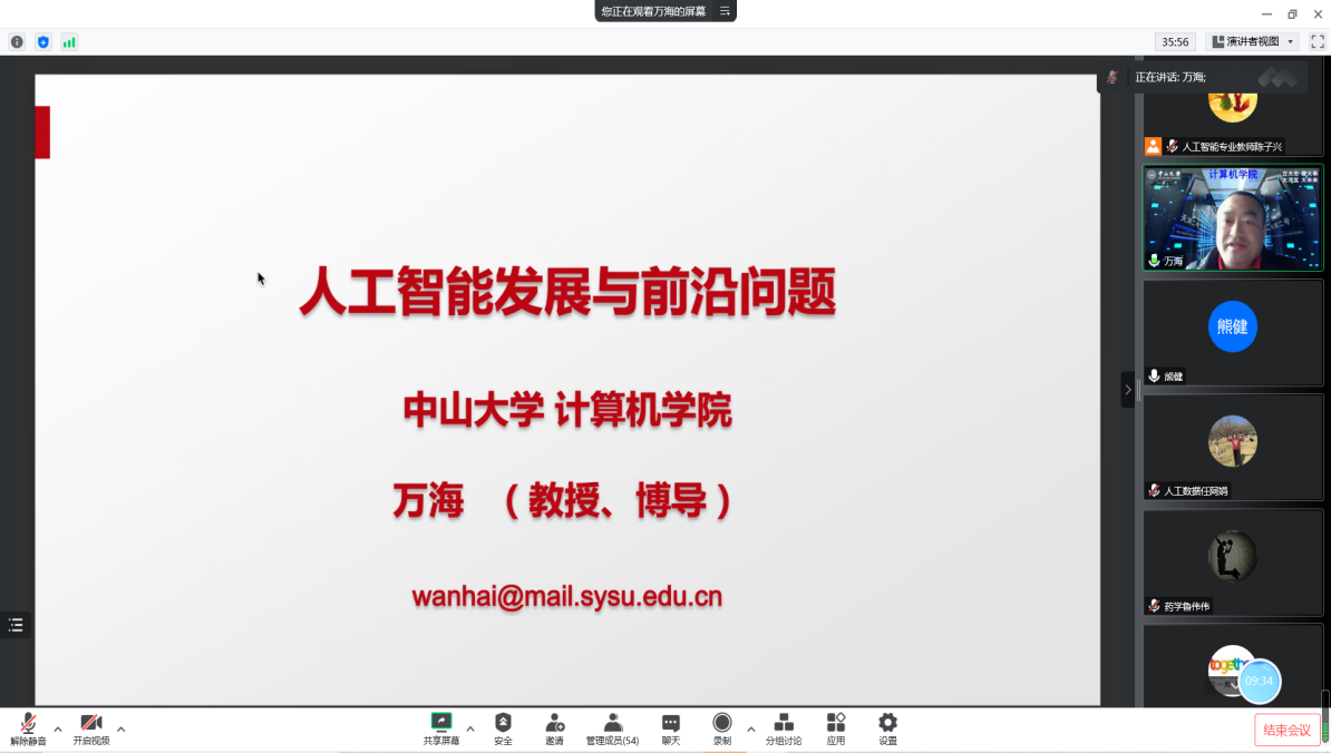 12月16日,我校邀请了中山大学计算机学院教授、博导万海作“人工智能发展与前沿问题”线上学术讲座。我校88名师生参与活动。讲座由suncitygroup太阳集团主任熊健主持。