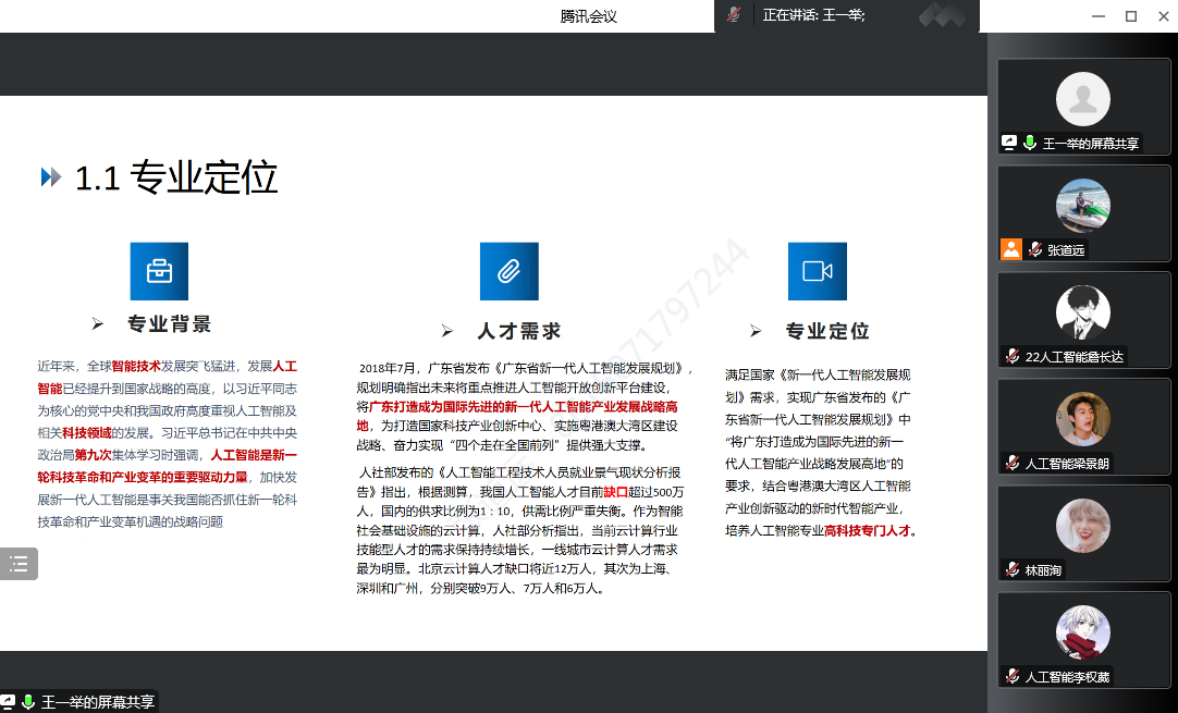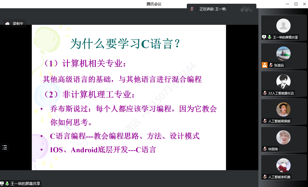 2022年10月14日3-4节,王一举教授通过腾讯会议平台,走进《计算机程序设计I》课堂为我系2022级人工智能专业带来了一堂精彩的授课。王教授从专业开设背景到专业定位,以及该专业目前市场的巨大人才缺口,一一作了详细介绍,鼓励同学们认真学习,深耕专业。在课程专业上,王教授介绍了学习C语言的目的,C语言的优点,以及如何学习好C语言。通过简单举例让同学们感受编程的魅力,鼓励同学们大胆尝试,不要怕出错,只有看见问题才能找到修改的方案。