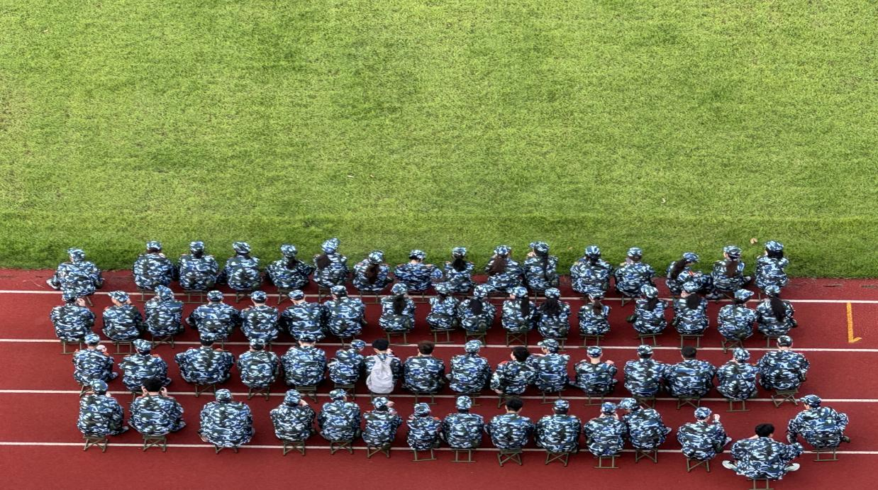 在红色的塑胶跑道上,我系的新生们身着统一迷彩服,组成整齐的方阵。他们身姿挺拔,眼神坚毅,融入每一次立正、稍息、齐步走的训练中。站军姿时,他们如青松般屹立,任凭烈日炙烤,依旧纹丝不动;队列训练中,他们步伐铿锵,口号嘹亮,每一个动作都力求精准。
