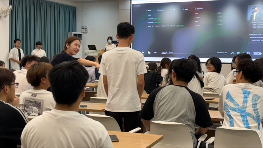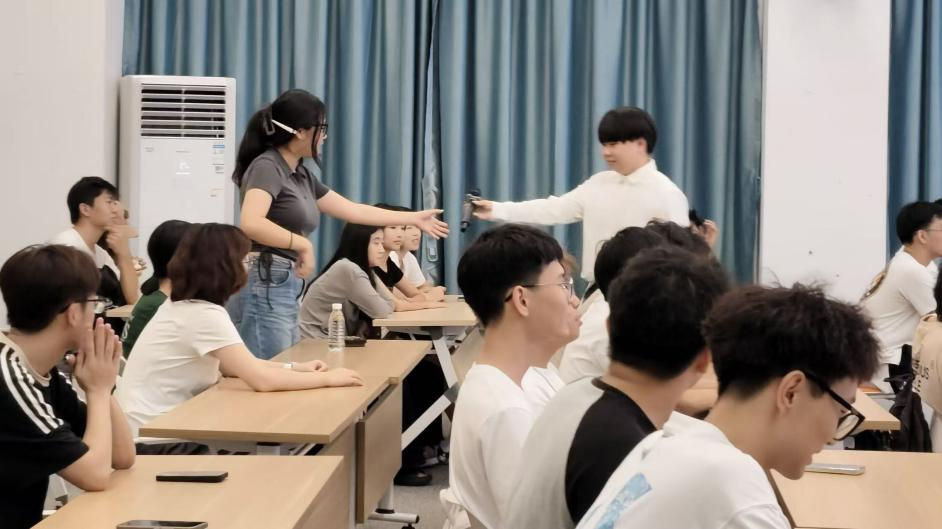 晚会以“击鼓传花”游戏拉开序幕。随着欢快的鼓点节奏,象征好运的“花球”在新生手中快速传递。当鼓声戛然而止,手持“花球”的同学需完成趣味挑战——诙谐的表演引得全场笑声不断。随后进行的“听歌识曲”环节则将气氛推向高潮,曲目涵盖经典影视金曲与当下热门流行乐,新生们踊跃抢答,展现了青春的活力与音乐素养。