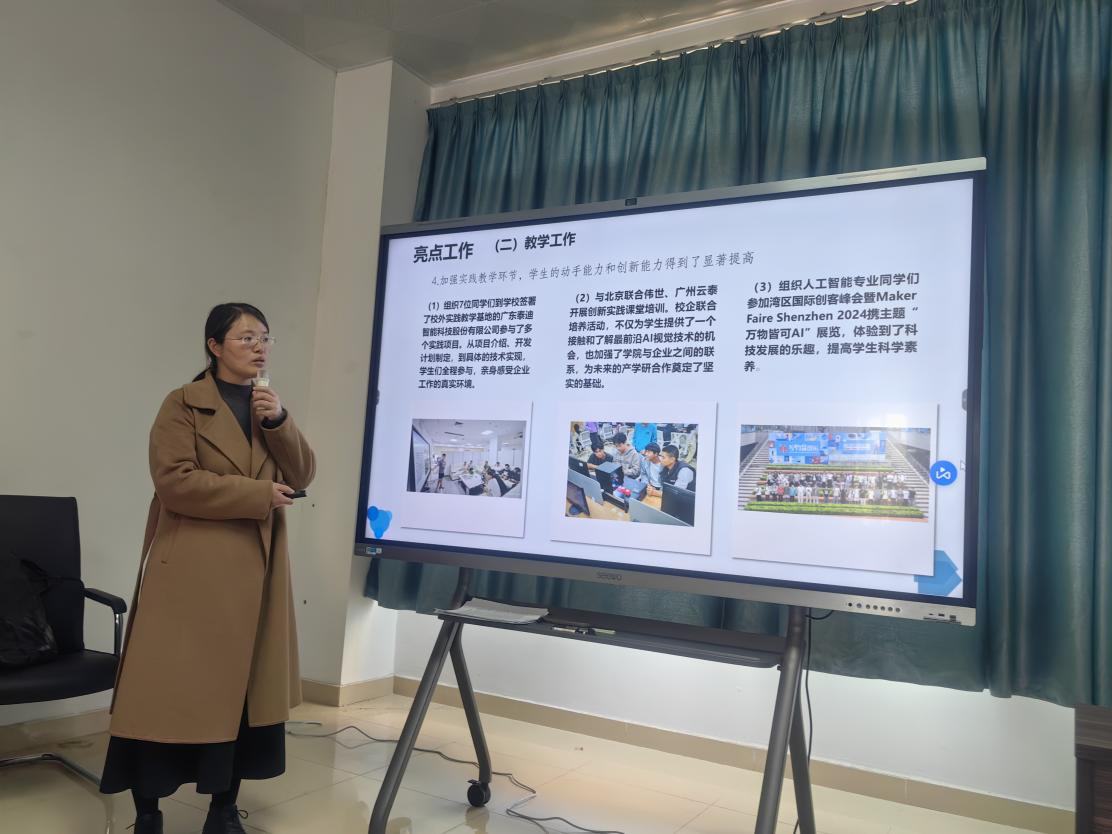 会上,陈敏琼副主任汇报了我系本年度的工作亮点。在分管校领导姚正安教授、学校督学刘东远博士的领导下,我系师资队伍与组织建设成果斐然,成功引进了一批具有博士学位或高级职称的优秀人才,为教学与科研注入了强劲动力。教学工作稳步推进,成果丰硕;竞赛工作更是屡创佳绩,彰显学生实力。此外,系里对课程体系进行了优化调整,加强了课程思政建设,将思政元素有机融入专业课程教学中,培养学生树立正确的价值观与人生观。积极引导学生参与各项文化活动,丰富学生的校园生活。并提出2025年,我系仍需加强党建引领,争取发表更多高质量的学术论文,继续加强学生党团和班级建设,关注学生的就业、考研等自身发展需求。
