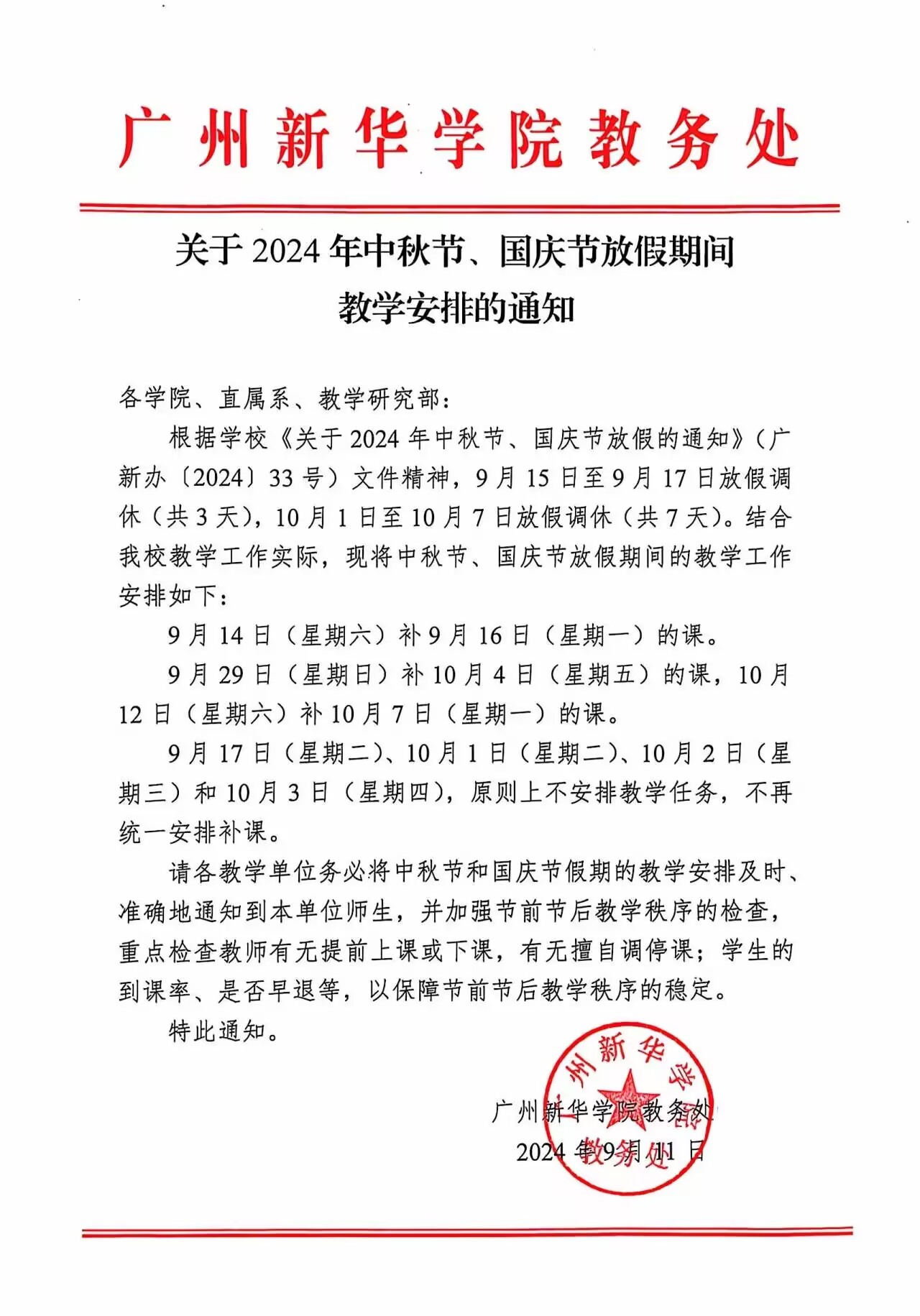 关于 2024年中秋节、国庆节放假期间
